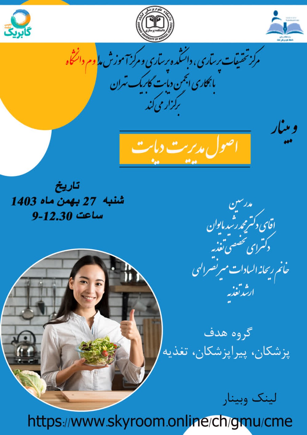 مركز تحقيقات پرستاري، دانشكده پرستاري و مركز آموزش مداوم دانشگاه، با همكاري انجمن ديابت گابريك تهران، وبيناري با موضوع اصول مديريت ديابت برگزار مي نمايد. اين وبينار به بررسي روشهاي نوين كنترل و مديريت ديابت اختصاص داشته و فرصتي ارزشمند براي تبادل دانش و تجربيات علمي فراهم خواهد كرد