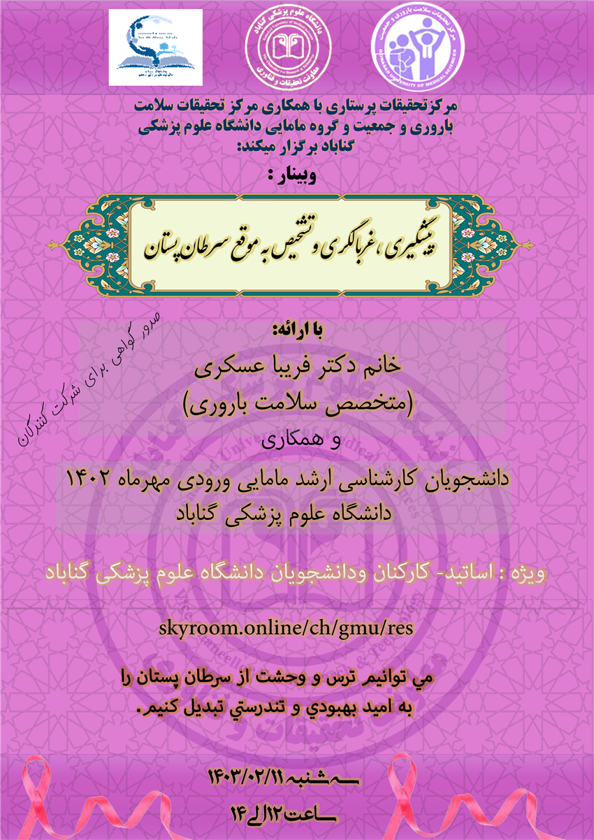 2 پیشگیری، غربالگری و تشخیص به موقع سرطان پستان (به صورت حضوری و مچازی)  خانم دکتر فریبا عسکری  1403/02/11 دانشجویان کارشناسی ارشد